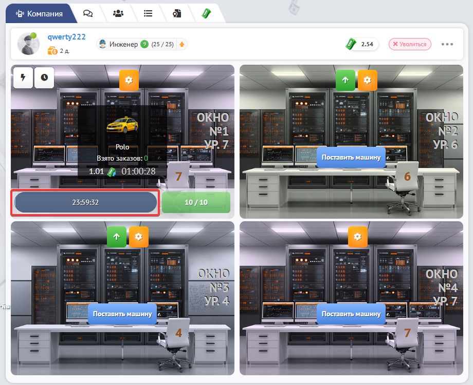 Вы устанавливаете свою машину или бульдозер в свободное окно. Чтобы установить технику нужно кликнуть “Поставить машину”